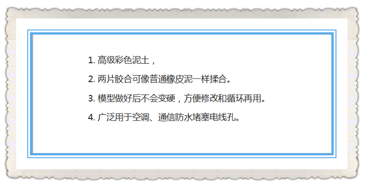 目前常用的油泥材料主要有以下幾種。第一種是工業(yè)粘土(滑石粉)60%,柔性粘結(jié)劑(油脂即黃油)30%,固性粘結(jié)劑(石蠟或凡士林)10%。第二種是蠟9%~10%,硫磺50%~55%,灰9%~10%,油脂(黃油)20%~25%,樹脂、顏料少許。第三種是建筑用油泥,成分為粘土和桐油等。